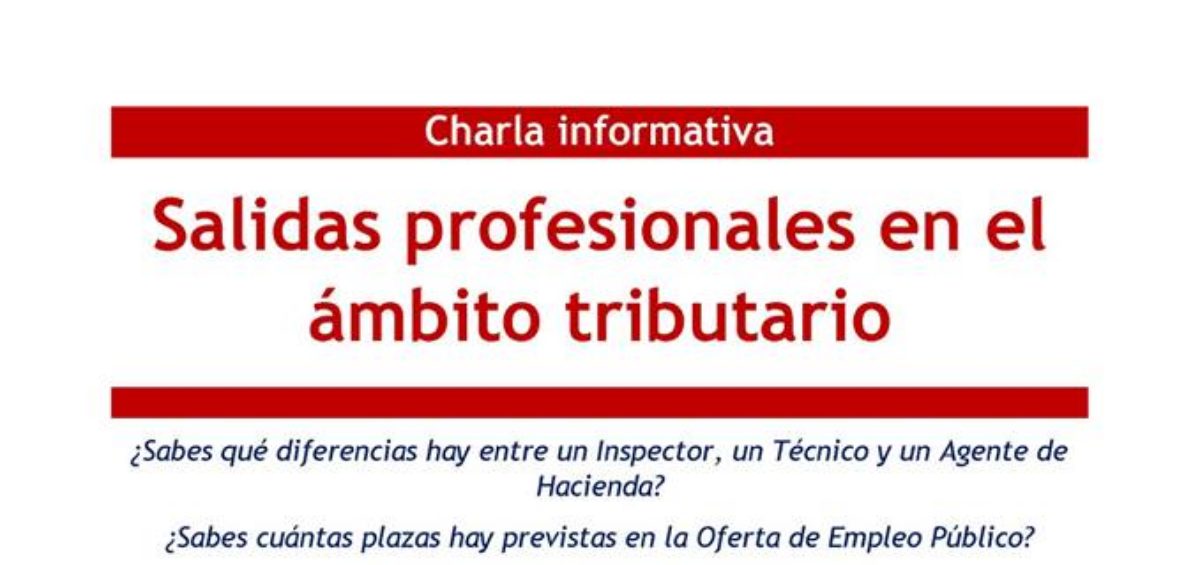 Charla informativa sobre salidas profesionales en el ámbito tributario para graduados de la Facultad de Derecho y de la Facultad de Economía y Empresa. ¿Sabes qué diferencias hay entre un Inspector, un Técnico y un Agente de Hacienda? ¿Sabes cuántas plazas hay previstas en la Oferta de Empleo Público? ¿Sabes cuáles son los requisitos de acceso?Leer Más
