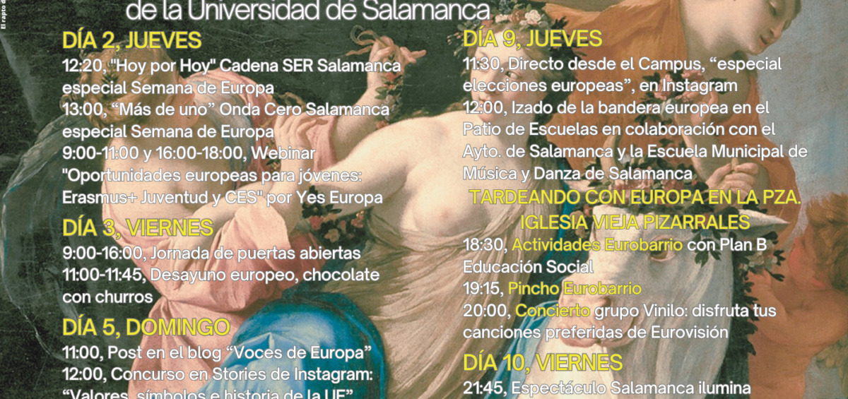 El Centro Europe Direct Salamanca invita a participar en las actividades gratuitas que tendrán lugar durante la Semana de Europa (del 2 al 10 de mayo). Los formularios para inscribirse en las actividades con invitación se activarán el día 2 de mayo a partir de las 9:00 h. La Semana de Europa del Centro Europe Direct Salamanca viene cargada de actividades: conciertos, ruta del pinchoLeer Más
