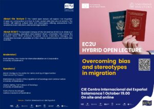 Este miércoles 1 de octubre a las 19:00h, el Centro Internacional del Español acoge la primera EC2U Hybrid Open Lecture. El evento, moderado por el vicerrector Raúl Sánchez, abordará el papel de la migración en nuestras comunidades y cómo fomentar relaciones interculturales sostenibles. La entrada es libre hasta completar aforo y podrá seguirse en directo a través de YouTube.