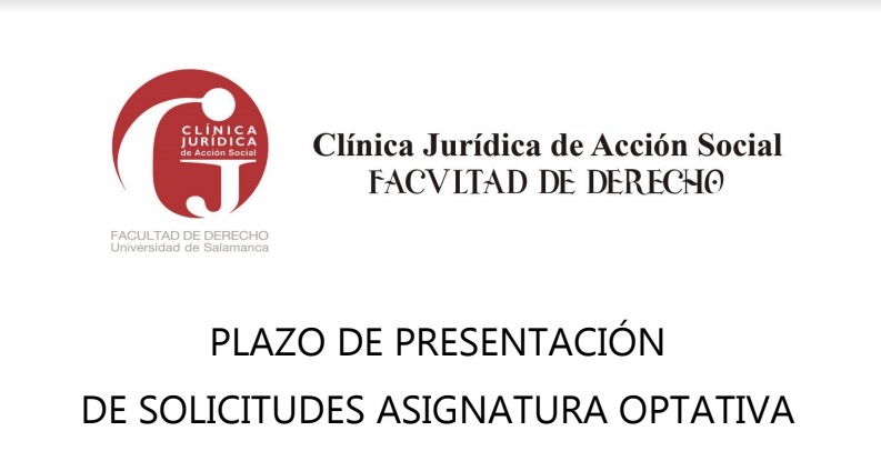 El plazo de presentación de solicitudes para la asignatura optativa Clínica Jurídica de Acción Social, estará abierto desde las 00.00h del 19/4/2018 hasta las 23:59h del 29/4/2018. Asimismo, se convoca reunión informativa para los estudiantes interesados el día 18 de abril, a las 17:00h en el aula 009.