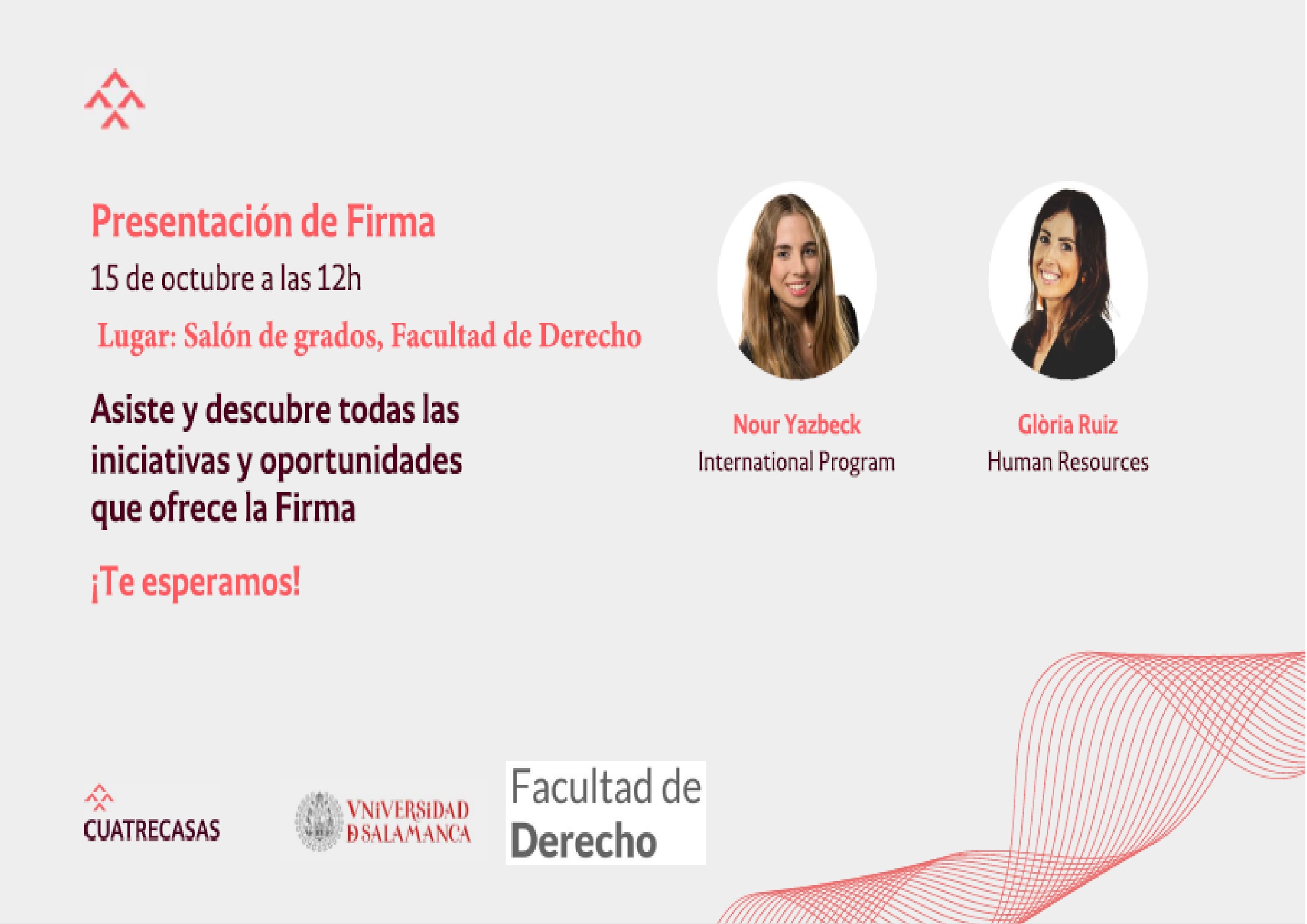 El próximo martes 15 de octubre tendrá lugar la presentación del Despacho Cuatrecasas a las 12.00h en el Salón de Grados. A esta presentación asistirán dos socias del despacho que explicarán su funcionamiento interno así como los procesos de selección para futuras incorporaciones. Puede ser una buena oportunidad para todos aquellos que estéis valorando conocer un poquito más acerca de esta salida profesional.